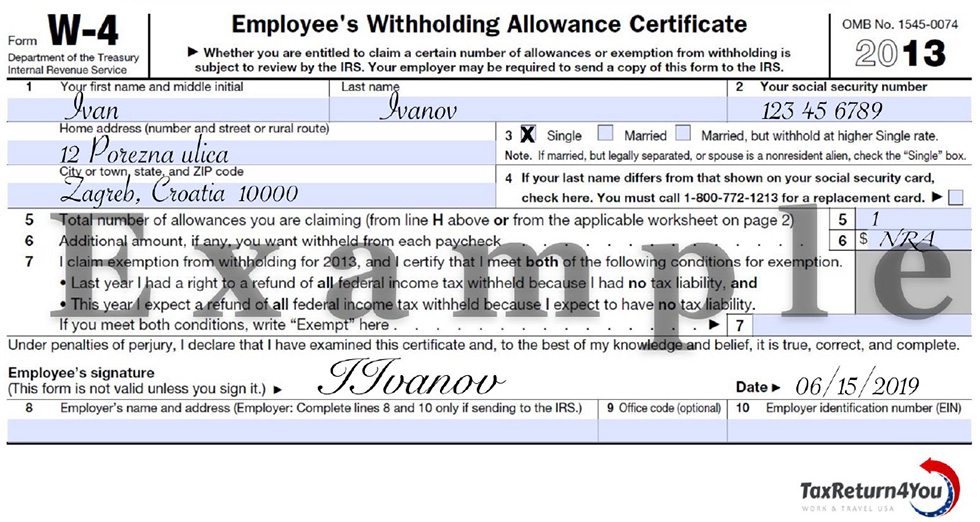 Before you start working in the US your employer will provide you with the paperwork you have to fill out so you can legally work in the US. First document that is very important for tax return purposes is Form W-4.